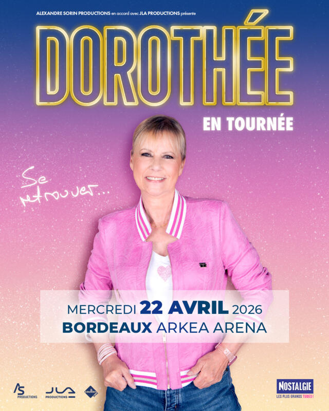 Après l’immense succès de l’émission Merci Dorothée ! célébrant sa fabuleuse carrière et qui a réuni près de 5 millions de téléspectateurs sur TF1 et suite au carton de son retour sur scène au Palais des Congrès de Paris les 4 et 5 avril 2026, sold out en l’espace de quelques minutes, Dorothée, l’icône de plusieurs générations, réserve une nouvelle surprise au public. En effet, 15 ans après sa dernière série de concerts à l’Olympia et Bercy, Alexandre Sorin Productions en accord avec JLA Productions a le plaisir d’annoncer le retour tant attendu de Dorothée sur scène pour deux représentations exceptionnelles au Palais des Congrès de Paris, le samedi 4 avril 2026 et le dimanche 5 avril 2026 et également en tournée le vendredi 10 avril 2026 à Lyon (Halle Tony Garnier), le jeudi 16 avril 2026 à Bruxelles (ING Arena), le mercredi 22 avril 2026 à Bordeaux (Arkéa Arena) et le dimanche 26 avril à Nantes (Zénith). Entourée de musiciens et de danseurs, Dorothée écrira un nouveau chapitre de son histoire scénique et musicale, et proposera un concert exceptionnel centré autour de ses plus grands tubes… mais aussi de surprises et de beaucoup d’émotion ! Dorothée déclare : « Tout cet amour que vous m'avez témoigné depuis tant d'années, m'a fait réaliser que vous retrouver sur scène devenait une évidence. Se retrouver... pour le plaisir de partager les refrains qui ont jalonné nos vies. Se retrouver... tous ensemble, et vous entendre chanter à mes côtés. Se retrouver... pour se dire que ce n'est jamais terminé. Je compte sur vous ! "